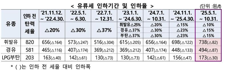 현재 적용 중인 인하율인 휘발유 10%, 경유 및 액화석유가스(LPG)부탄 15%가 더 유지된다.