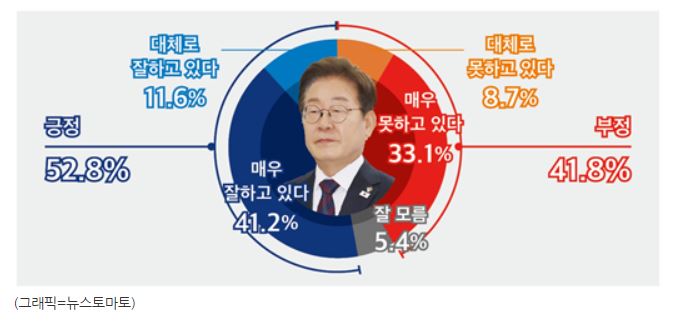 여론조사업체 미디어토마토가 뉴스토마토 의뢰로 지난 11~12일 만 18세 이상 전국 1037명을 대상으로 조사한 결과 이 대통령 국정 운영에 대한 긍정 평가는 52.8%로 나타났다. '매우 잘하고 있다' 41.2%, '대체로 잘하고 있다'는 11.6%였다.