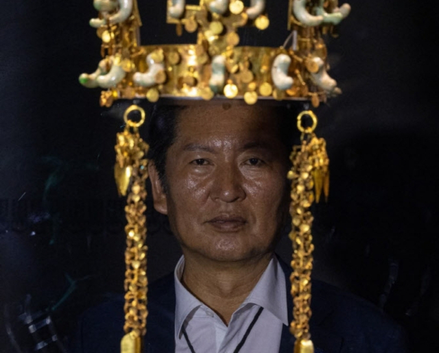 문제가 된 사진은 그 가운데 두 장이었다. 신라 왕관 중에서도 가장 화려한 유물로 알려진 천마총 금관(국보 제188호)을 감상하는 정 대표의 모습이 카메라 각도에 따라 실제로 머리에 왕관을 올린 듯한 착시로 표현됐다.