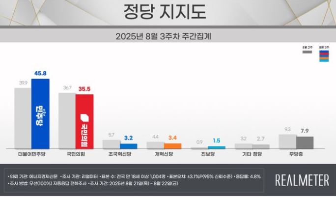 지난 21∼22일 전국 18세 이상 유권자 1천4명을 대상으로 한 정당 지지도 조사에서는 더불어민주당은 45.8% 국민의힘은 35.5%를 각각 기록했다.