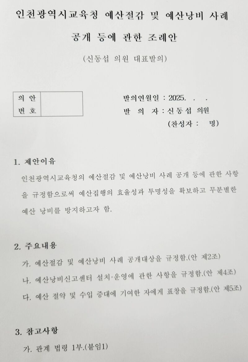 오늘 신동섭시의원 대표 발의한 '인천광역시 교육청 예살절감 및 예산낭비 사례 공개 등에 관한 조례안'은 인천시 교육청의 예산집행의 효율성과 투명성을 확보하고 무분별한 예산 낭비를 방지하고자 제정 하였습니다.