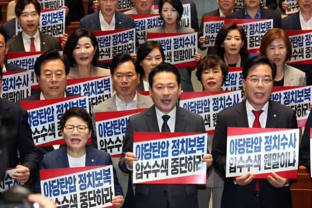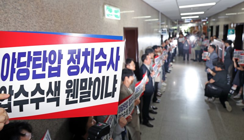 국민의힘이 조은석 특검의 원내대표실 압수수색 시도 저지를 위한 규탄 대회를 열고 “정치보복 압수수색을 당장 중단하라”고 촉구했다.