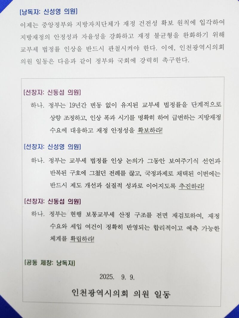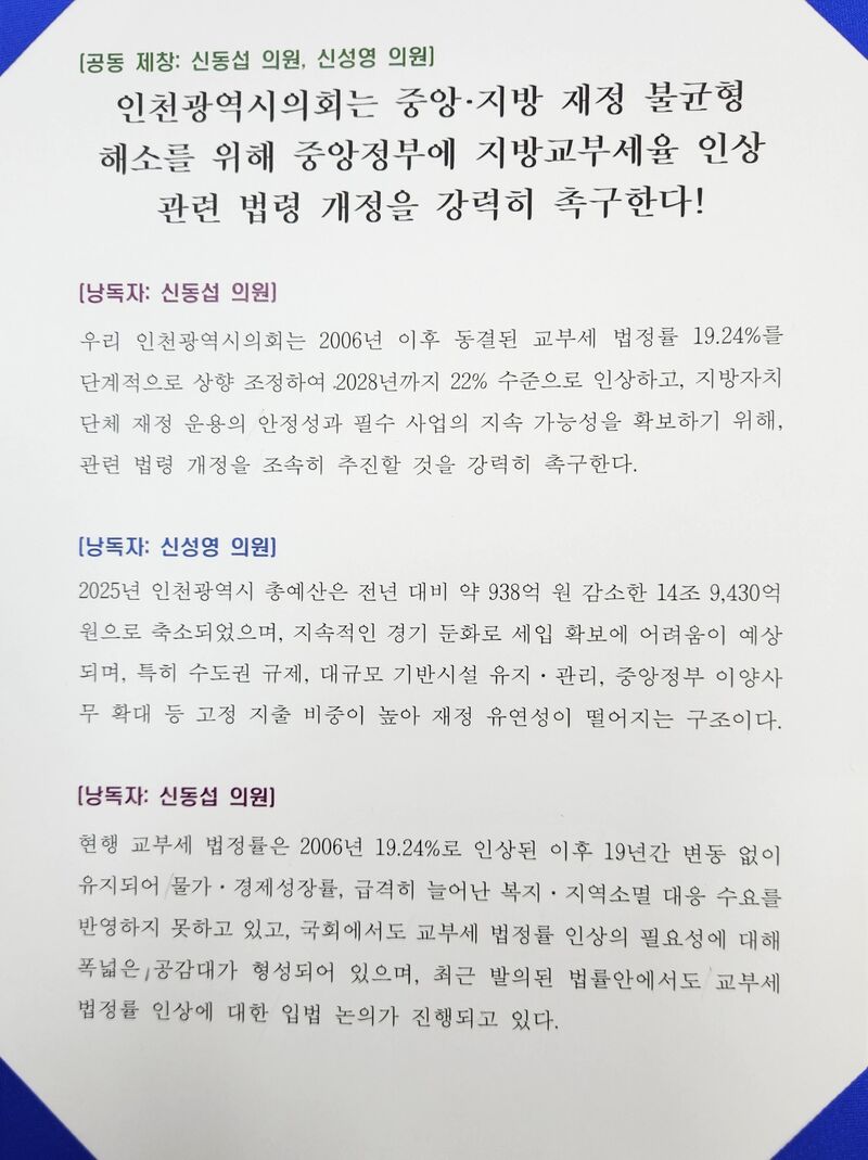 신동섭 시의원은 대표 발의하여 인천광역시의회 제303회 임시회에서 '중앙ㆍ지방 재정 불균형 해소를 위한 지방교부세율 인상 촉구 결의안'을 발의ㆍ통과시켰습니다.