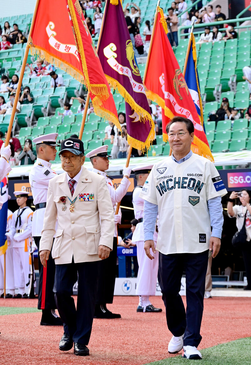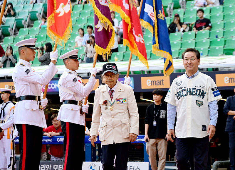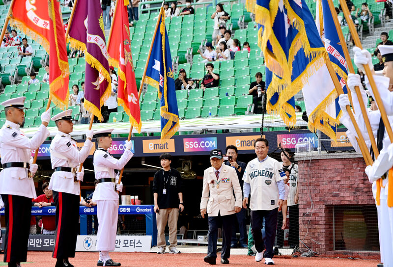 그라운드에서는 ‘인천 랜딩 스타 세리머니’로 참전용사와 함께 입장해 예우를 표했고, 해군 의장대와 육군 제17사단 군악대가 격식을 더했습니다.