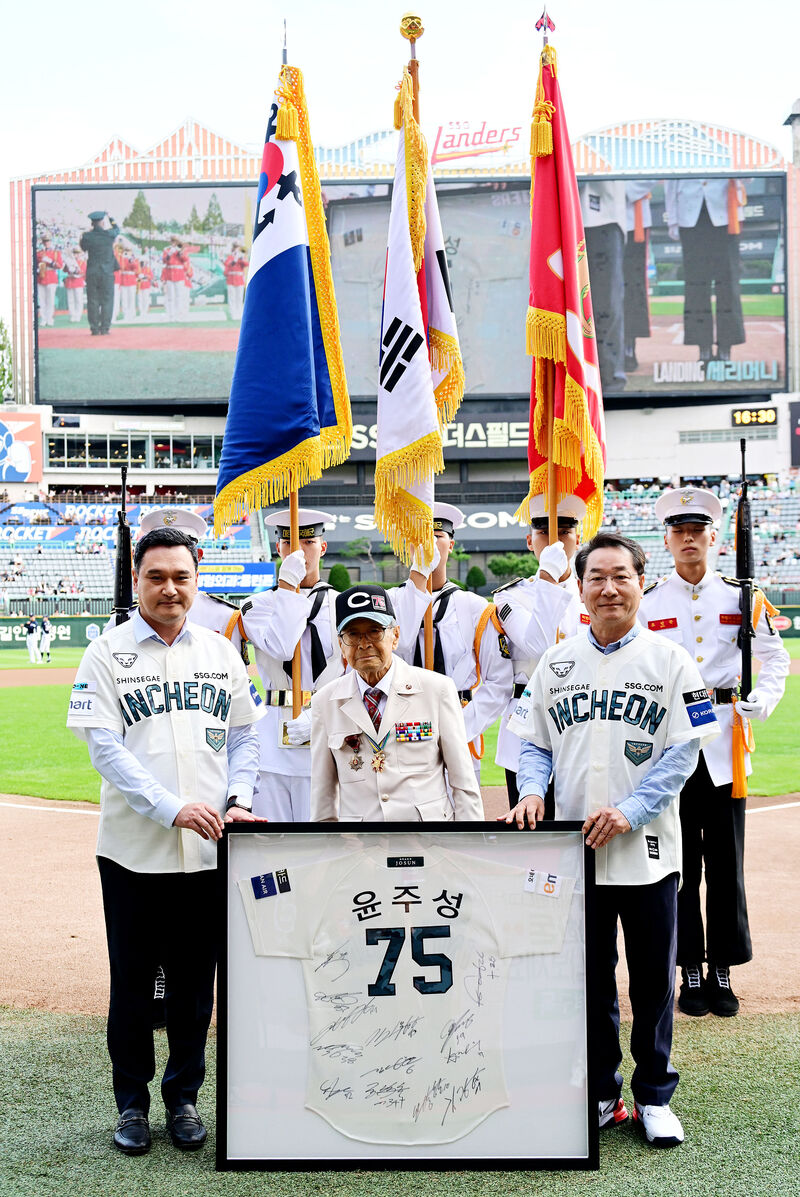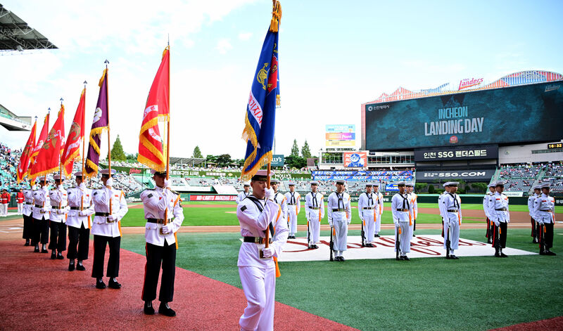 모자에는 기념 패치가 부착되며 선수단은 '랜딩데이' 해당 유니폼을 착용하고 경기에 나선다.경기 전'인천 랜딩 세리머니'가 진행된다. 해군 의장대와 육군 17사단 군악대가 함께 참여해 예우를 더했.이 자리에서 참전용사 윤주성 씨에게는 SSG 선수단 전원의 친필 사인이 담긴 특별 유니폼이 전달된다.