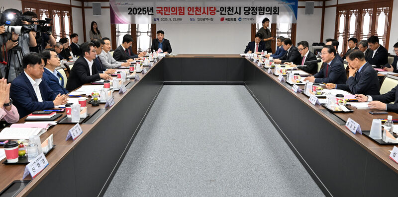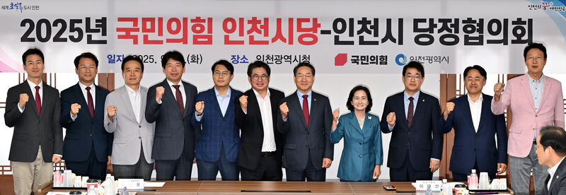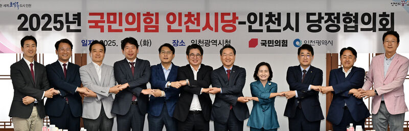 2025년 국민의힘 인천시당-인천시 당정협의회'에서 박종진 국민의힘 인천시당위원장,배준영국회의원,윤상현국회의원,이행숙당협위원장,김기흥당협위원장,신재경당협위원장,정승연당협위원장,유재홍당협위원장,심재돈당협위원장,손범규당협위원장등이 참석 하였다.
