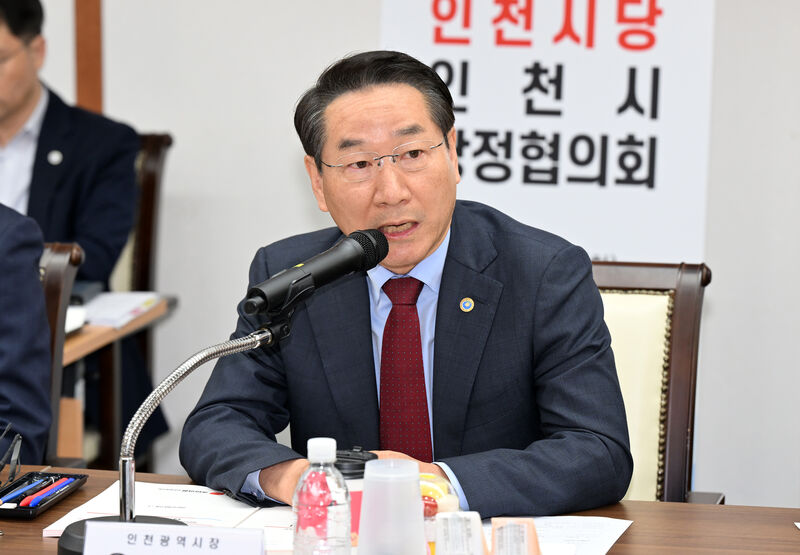 유정복 인천시장이 23일 화요일 오전 인천 남동구 인천시청 장미홀에서 열린 2025년 국민의힘 인천시당-인천시 당정협의회에서 유정복 시장 인사말를 하고 있다.