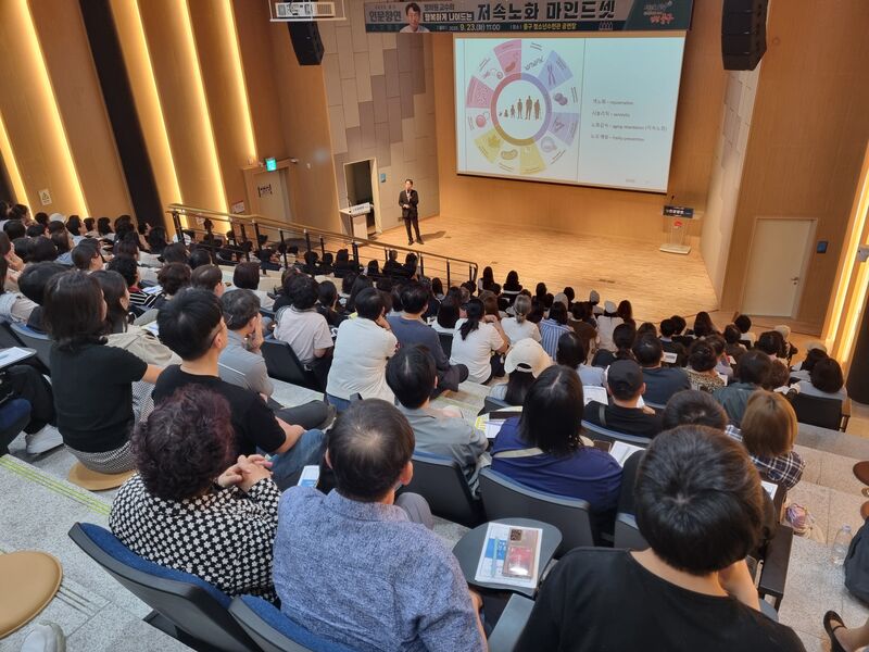 이번 강연은 구민 200여 명의 열띤 호응 속에 ‘행복하게 나이 드는 저속노화 마인드셋이란 주제로 진행됐다.