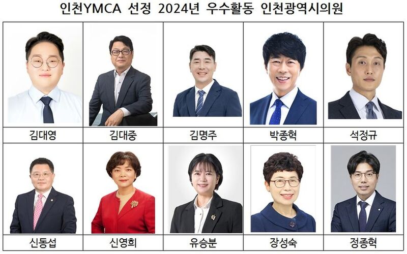 인천YMCA가 제9대 인천시의회 2024년 활동에 대한 모니터링을 진행해 우수 의원 10명을 선정했다고 1일 밝혔다.
