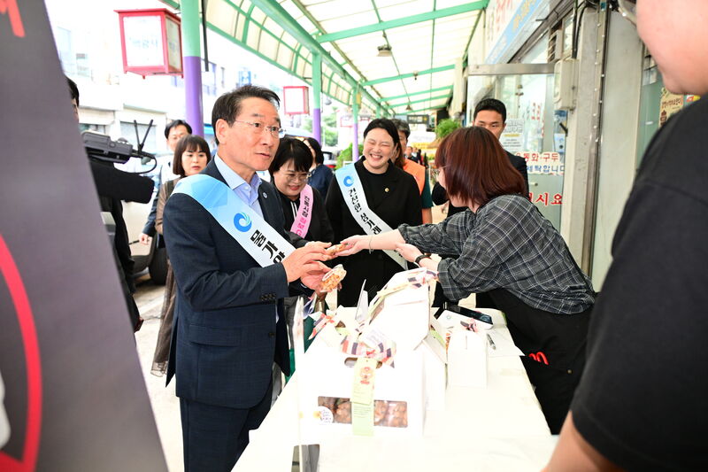 유 시장은 부평구 열우물전통시장을 방문해 개별 점포를 둘러보며 상인들을 격려했다장바구니를 손에 든 유 시장은 상인들과 일일이 인사를 나누며 떡과 멸치도라지샤인머스캣양말 등 식품과 생필품을 직접 구입했다