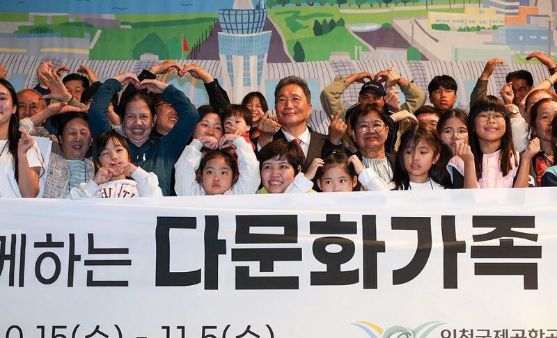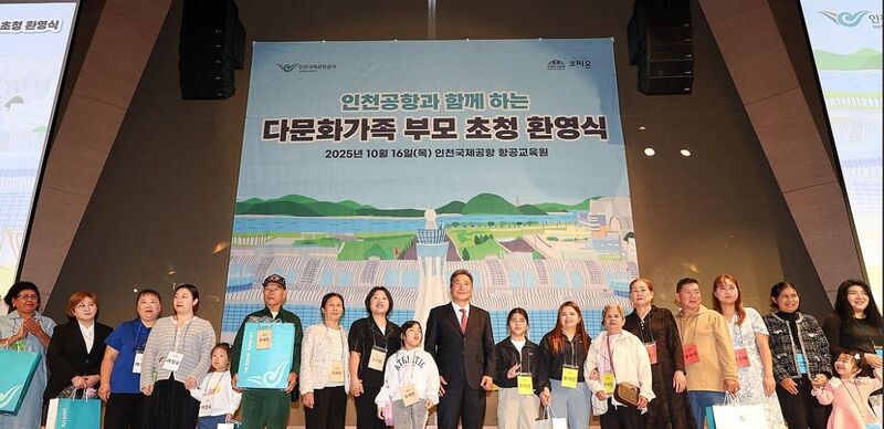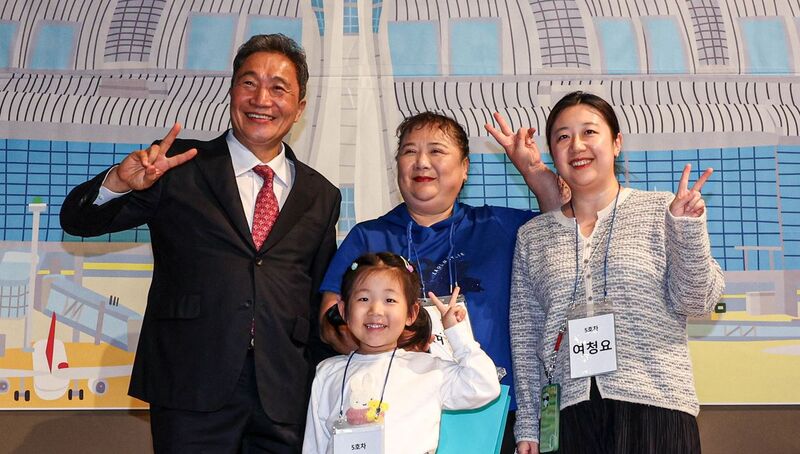 이학재 인천국제공항공사 사장이 16일 인천 중구 인천국제공항공사 항공교육원에서 열린 '다문화가족 부모초청 환영행사'에서 참석자들과 기념촬영을 하고 있다.