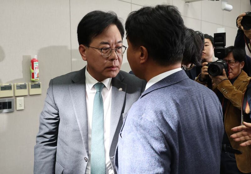 이 의원도 기자회견을 통해 "정회 후 급히 나가야 하는 상황이어서 따라나가는데 송 원내대표가 격한 표정으로 '민주당이 국감을 하지 않으려는 생각'이라고 말해 운영위의 한 사람으로서 '국감을 방해하는 것은 당신들'이라고 했더니 (송 원내대표가) 몸을 던지다시피 했다"고 반박했다.