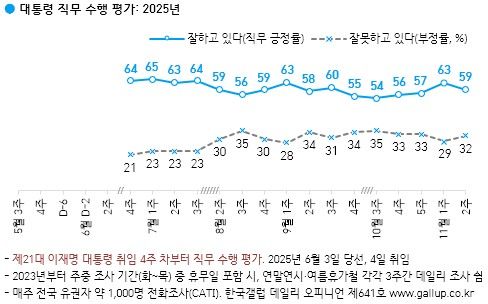 李대통령 지지율 59%…지난주보다 4%p 하락[한국갤럽]