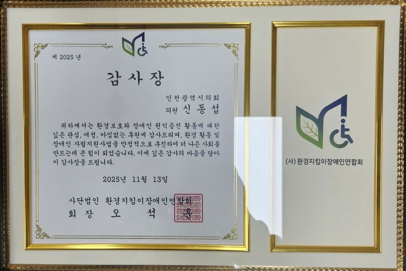신동섭 시의원은 환경 보호와 장애인 권익증진에 기여한 공로로 지난 1113일 사)국제휘트니스연합회와 사)환경지킴이장애인 연합회로부터 감사패와 감사장을 각각 받았다.