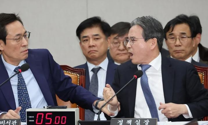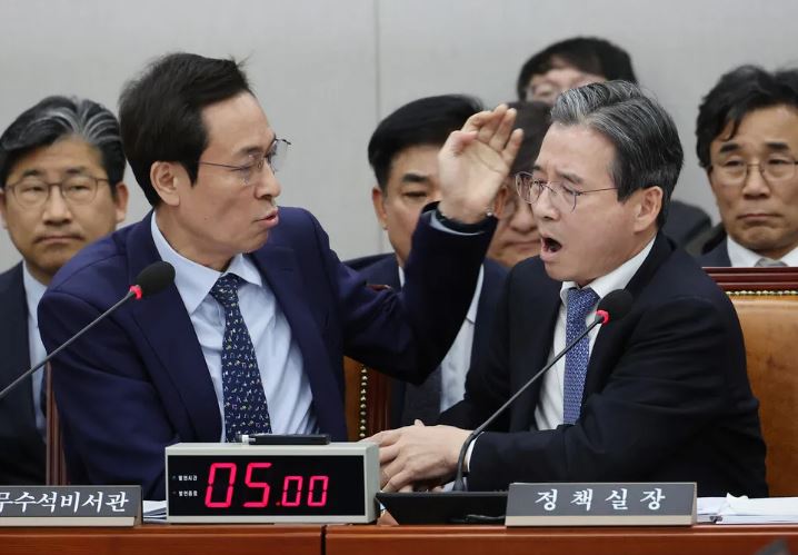김용범 대통령실 정책실장이 18일 국회에서 야당 의원 질의에 고성으로 항의하다 더불어민주당 김병기 원내대표가 나서서 제지하는 일이 벌어졌다