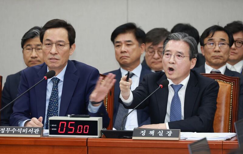 이 과정에서 민주당 원내대표인 김병기 위원장은 5차례 넘게 김 실장을 불렀지만 멈추지 않자 "여기가 정책실장 화내는 곳이냐"고 목소리를 높이자 김 실장은 그제야 "송구하다"며 그쳤다.