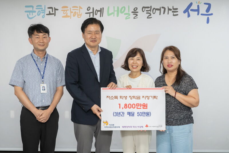 인천 서구(구청장 강범석) 28검단아라태평양약국(대표 어강해)이 관내 저소득층 청소년 가구에 1,800만원을 기부했다고 29일 밝혔다장학금은 3년간 매달 50만원씩 지급될 예정이다.